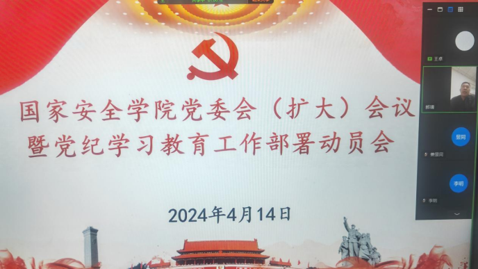 4月14日晚,国家安全学院召开党委会(扩大)线上会议,部署动员学院党纪学习教育工作。学院党委委员、支部书记、全体教职工党员参加会议。会议由院党委书记李政敏主持。