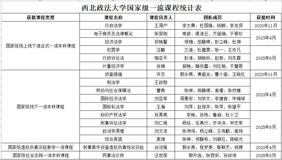 8月21日,教育部公示了第三批国家级一流本科课程名单,拟认定5999门课程为第三批国家级一流本科课程,其中,线上课程1000门,虚拟仿真实验教学课程500门,线下课程1842门,线上线下混合式课程2206门,社会实践课程451门。我校此次共有8门课程拟入选国家级一流课程,其中犯罪学、行政诉讼法、计量经济学为线上线下混合式课程,知识产权法学、刑事诉讼法学、政治学原理、综合英语为线下课程,民事法诊所为社会实践课程,获评数量上创历史新高。 近年来,教务处以提升人才培养质量为核心,以年度检查为抓手,在课程建设中贯彻OBE理念,推进教学改革创新,完善以质量为导向的课程建设激励机制,形成了“国家级、省级、校级”三级梯度的一流课程培育体系。本轮申报,教务处牵头科学谋划、认真准备、多方协调,邀请省内外知名专家反复打磨,全力做好服务保障工作,取得一定成效。学校现有国家级一流本科课程17门,省级一流课程(含省级课程思政示范课、省级特色线上建设项目课程)48门,充分体现了学校的办学水平和办学实力。 未来,教务处将继续发挥国家和省级一流本科课程在专业建设、教学改革等方面的示范引领作用,推动学校教育教学改革不断深化,为培养德智体美劳全面发展的高素质人才、建设特色鲜明的国内高水平大学奠定扎实的基础。 (供稿:教务处 撰稿:王鹏飞 审核:李大勇)