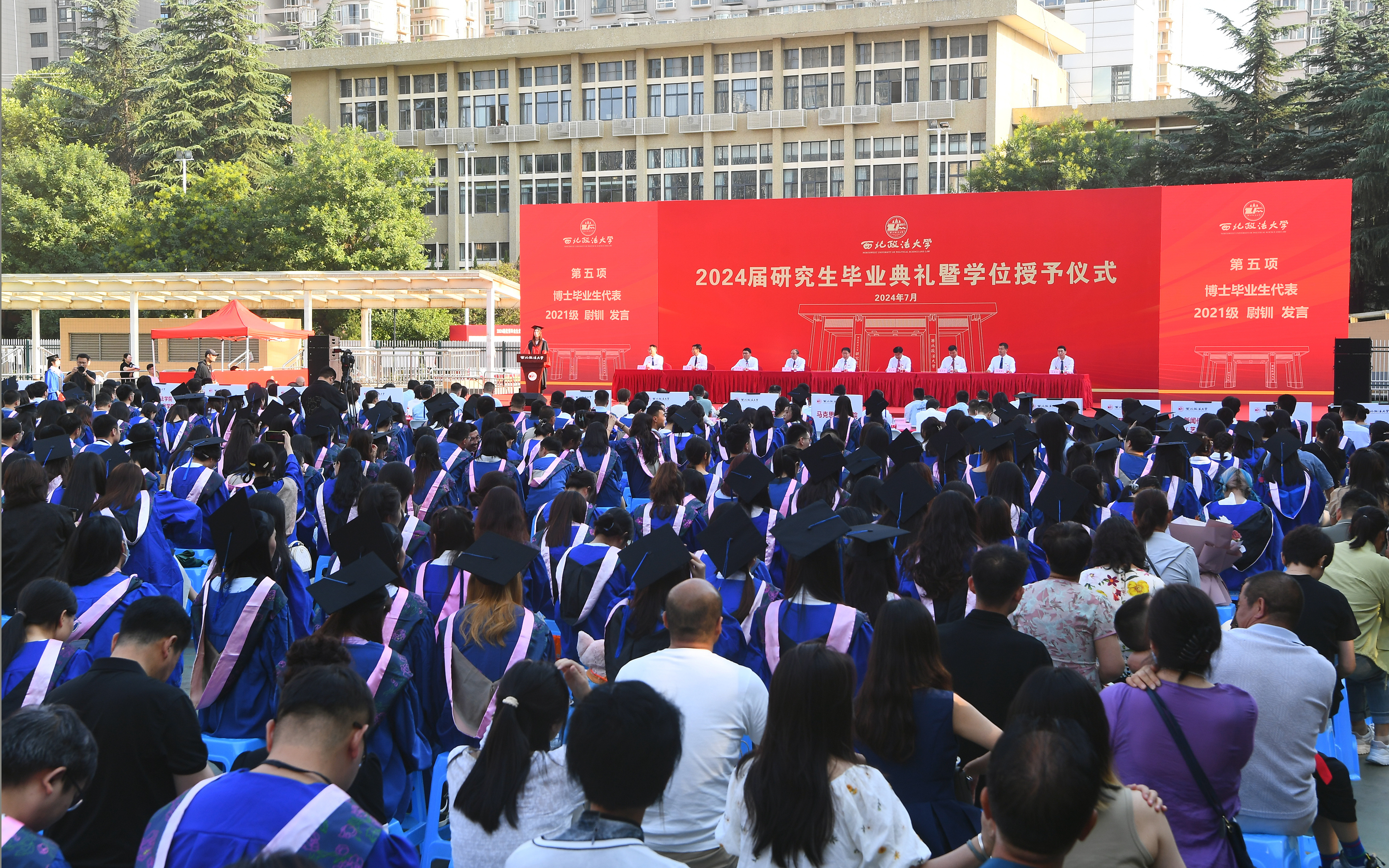 7月3日,西北政法大学2024届本科生毕业典礼暨学位授予仪式在长安校区举行。3038名本科生圆满完成学业,在师长亲友的共同见证下,开启人生新的航程。 校党委书记孙国华,校党委副书记、校长范九利等全体校领导和校党委委员出席。典礼由校党委副书记郭武军主持。 典礼在庄严的国歌声中拉开帷幕。 范九利代表全体师生员工向毕业生致以热烈祝贺,向支持帮助毕业生成长成才的老师和亲友们致以诚挚感谢。他以《有所为有所不为》为题,向毕业生讲授大学最后一堂“思政课”。他谈到,“为”与“不为”是生活的辩证法,是站位国家、服从大局的视野格局,是血脉传承、功夫到家的自信底气,是坚定目标、笃定前行的战略定力,是行有所止、言有所界的规矩法度。求学期间,大家在西法大校园里德法兼修、勤学善思,长才干、壮筋骨,淬炼青春底色,逐渐成长为堪当时代大任的先锋队、突击手。即将走出校门的你们,要把正确的政绩观、事业观装进出发的行囊,保持不甘平庸、不断向上的勇气,在“有为”中坚持,在“不为”中坚守,始终坚信流过的汗水和泪水,终会汇聚成灿烂繁星,熠熠生辉,照亮奔赴山海的路。讲话最后,他动情地说:“无论身在何处,母校永远是你们的家,期待我们再次相聚!” 副校长马朝琦宣读《西北政法大学关于表彰2024届优秀毕业生的决定》。学校授予哲学与社会发展学院丛林等256名毕业生和外国语学院蔺星月等15名内地生源赴疆赴藏学生“优秀毕业生”荣誉称号,校领导为“优秀毕业生”代表颁发荣誉证书。 教师代表、马克思主义学院院长魏奇以泰戈尔的《用生命影响生命》和毕业生共勉,希望他们秉承老延大优良传统,目标明确、志向坚定、勇毅前行,在中国式现代化建设征途中书写西法大人新的华章。 在校生代表、校三好学生标兵、商学院(管理学院)2021级学生李泽金向圆满完成四年学业的学长学姐致以诚挚祝福,希望他们铭记终南山下的“质朴厚重”、天平楼中的“朗朗正义”、图书馆里的“思想荟萃”,继续为母校建设发展增光添彩。 毕业生代表、国家奖学金获得者、民商法学院2020级学生房靖凯分享了自己大学四年间的收获与感动,表示将带上母校的期盼与恩师的嘱托,心怀“强国”使命,让青春在全面建设社会主义现代化国家的火热实践中绽放绚丽之花。 留学毕业生代表、电子商务与法律专业的玛伊娜(PALLAYEVA MAINA)来自哈萨克斯坦。她向一直给予自己无微不至关怀的老师、朋友致以衷心祝福和诚挚谢意,表示将加强学习、丰富阅历、提升能力。 毕业生亲友代表、经济法学院2020级学生包可扬的父亲包松林向老师们的无私奉献表示感谢,希望毕业生把个人理想追求融入党和国家事业发展,在时代的洪流中挺膺担当、成就未来。 毕业典礼结束后,各学院分别在满天星学术报告厅、天平楼AJ33模拟法庭、图书馆一楼报告厅、校务楼二楼报告厅进行本科生学位授予仪式。学位授予现场,导师们为每一位在校毕业生正冠拨穗并合影留念。 “这儿是法治人才成长的摇篮,理想让我们在这儿相聚……”雄壮嘹亮的《西北政法大学校歌》在校园上空久久回荡,诉说着母校的深深祝福和依依不舍。愿满载荣光和梦想的2024届本科毕业生,以敢为人先的志气、敢于超越的勇气、蓬勃向上的朝气、革故鼎新的锐气,逐浪而行、奔赴热爱,在更广阔的星辰大海续写人生华章。 各职能部门负责人,各学院党委书记、院长、副书记、本科生毕业班辅导员,教师代表、在校生代表、毕业生亲友代表、留学生代表、校友代表及2024届本科毕业生参加典礼。 (供稿:党委宣传部 撰稿:张佼 审核:燕福民)