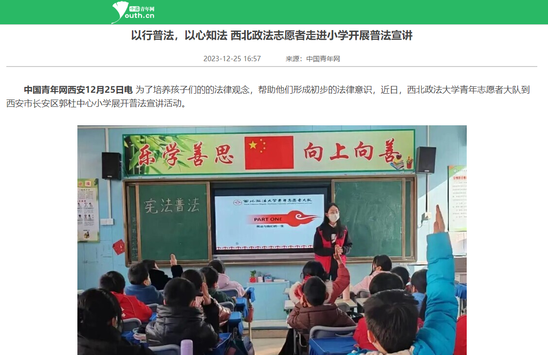 以行普法,以心知法——西北政法大学志愿者走进小学开展普法宣讲 中国青年网西安12月25日电 为了培养孩子们的的法律观念,帮助他们形成初步的法律意识,近日,西北政法大学青年志愿者大队到西安市长安区郭杜中心小学展开普法宣讲活动。 在宣讲的过程中,西北政法大学青年志愿者大队向小学生们介绍了宪法的含义、权利和义务的内涵,并通过视频向同学们展示了宪法与个人的关系,将宪法知识以易懂的方式传输给孩子们。 在宣讲课堂现场,青年志愿者大队用生动的图片向同学们讲解宪法知识,并用提问的方式帮助同学们巩固,使他们能够更直观地感受到宪法的重要性和意义。为了使课堂更生动,青年志愿者大队播放了宪法相关的视频,用同学们感兴趣的方式为他们讲解宪法知识。 活动中,孩子们们认真听讲,积极发言,课堂气氛十分活跃。青年志愿者大队还和同学们进行互动,共同学习如何成为一名知法懂法的公民。 据西北政法大学相关负责老师介绍,此次宣讲活动旨在通过普及宪法知识,让孩子们知法懂法,从小培养他们的法律意识,树立法律权威,为他们的成长保驾护航。(王洋) 【中国青年网】以行普法,以心知法——西北政法大学志愿者走进小学开展普法宣https://t.m.youth.cn/transfer/index/url/df.youth.cn/jyzx/202312/t20231225_14985945.htm