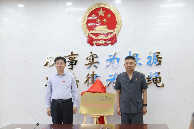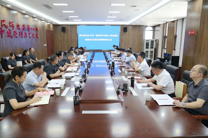在延安市中级人民法院,我校与延安中院战略合作签约暨“法科研究生实践教学基地”揭牌仪式顺利举行。延安中院党组副书记、副院长雷钧主持仪式。双方先后签订了《院校合作框架协议》和《马锡五式人民法庭创建与诉源治理的延安样本》科研项目合作协议,范九利与刘群为“西北政法大学法科研究生实践教学基地”揭牌。