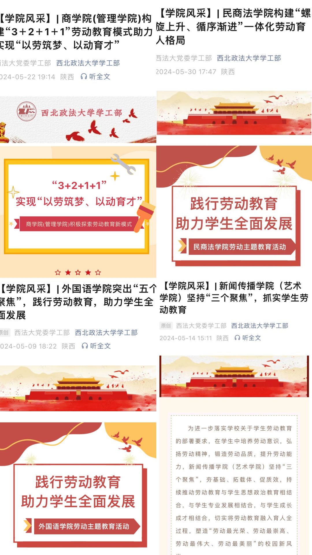 各学院结合学科特色和学生特点,形成了一批具有示范性、引领性的劳动育人成果,如民商法学院构建“螺旋上升、循序渐进”一体化劳动育人格局;新闻传播学院(艺术学院)坚持“三个聚焦”,抓实学生劳动教育;商学院(管理学院)构建“3+2+1+1”劳动教育模式助力实现“以劳筑梦、以动育才”;外国语学院突出“五个聚焦”,践行劳动教育,助力学生全面发展等,起到良好的示范效果。