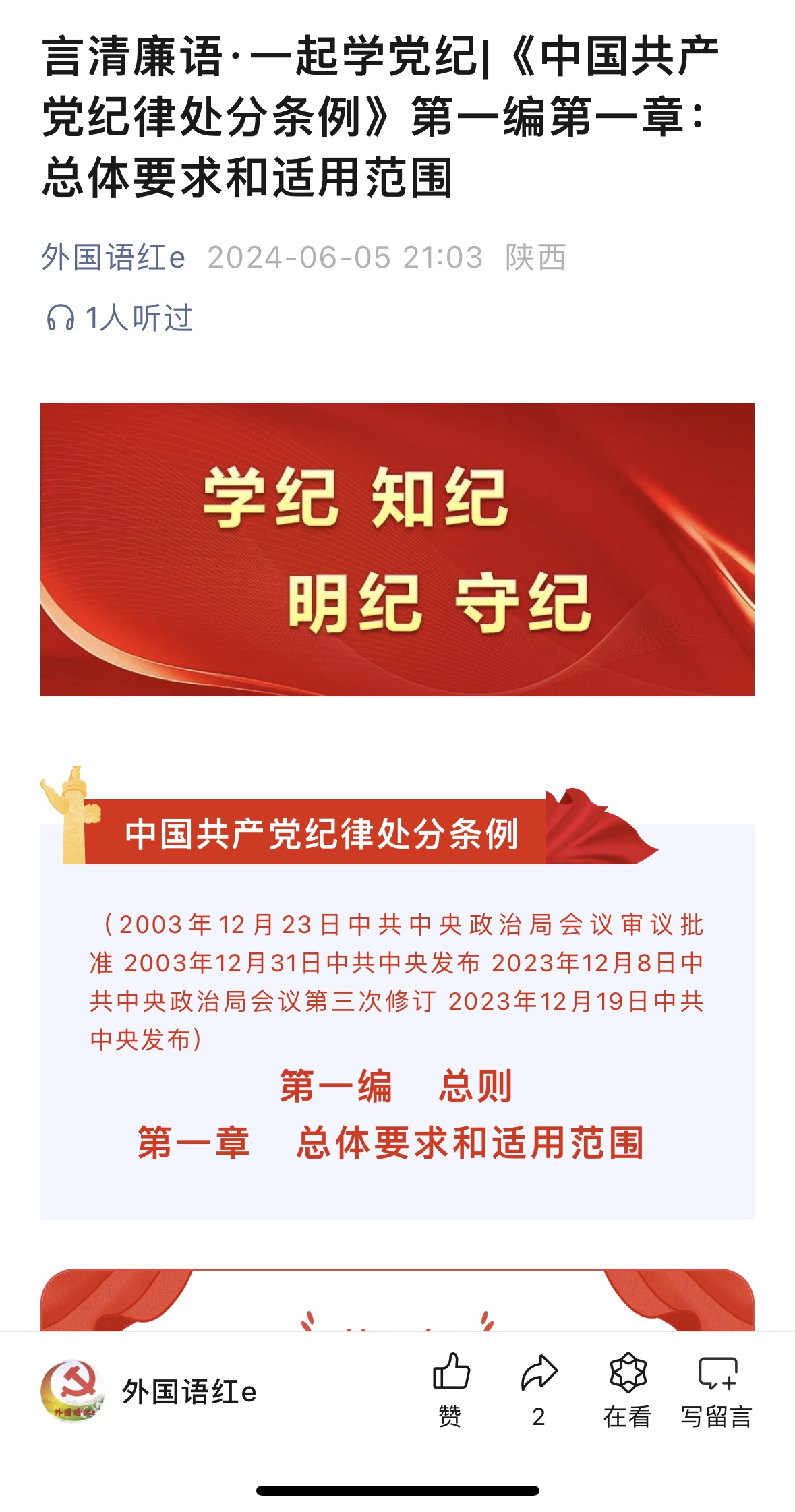 聚焦学习重点,扎实学习《中国共产党纪律处分条例》(以下简称《条例》)。为确保党纪学习教育内容、对象“全覆盖”,制定《外国语学院党委关于开展党纪学习教育的实施方案》,组织学院7个党支部依托三会一课、学习强国、主题党日等载体,带领师生党员学《条例》原文,开展警示教育,深刻剖析违纪典型案例,用身边事教育身边人,让党员、干部受警醒、明底线、知敬畏。