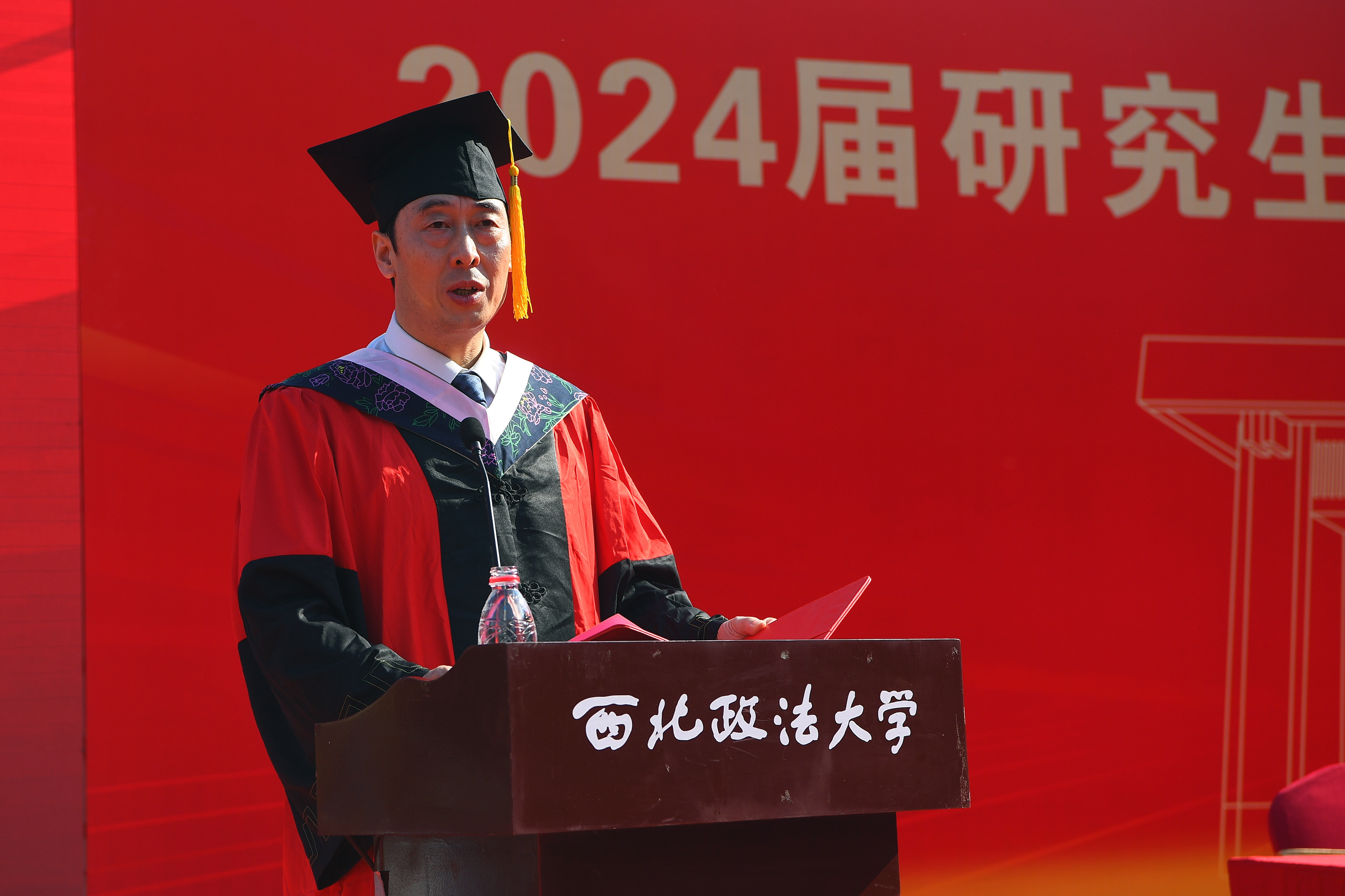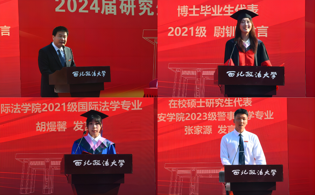 导师代表潘俊武在发言中对全体毕业生提出了三点期盼,首先要树立远大目标;其次要有乐观的精神;最后要有持之以恒的劲头。敬终如始、绵绵用力,用坚韧来书写人生的精彩。博士生代表尉钏表示,西法大人必将持续不懈地为社会主义法治化进程贡献智慧与力量,坚定不移地推动法治建设的进步与发展,为构建更加公正、高效的法治体系而不懈奋斗。国际法学院2021级硕士毕业生代表胡熳馨表示,西法大“法治信仰、中国立场、国际视野、平民情怀”的育人理念提出了掷地有声的标准和要求,解答了学子们内心有关自我、有关成长、有关发展的所有疑惑,有力地告诉西法大学子应当坚定方向、坚守真理、追求卓越、德行兼备。在校生代表公安学院2023级警事法学专业硕士研究生张家源表示,无论毕业的学长学姐走得有多远,母校的支持、老师的挂念和学弟学妹们的祝福永远伴随着西法大学子,西法大永远是学子们温暖的家。