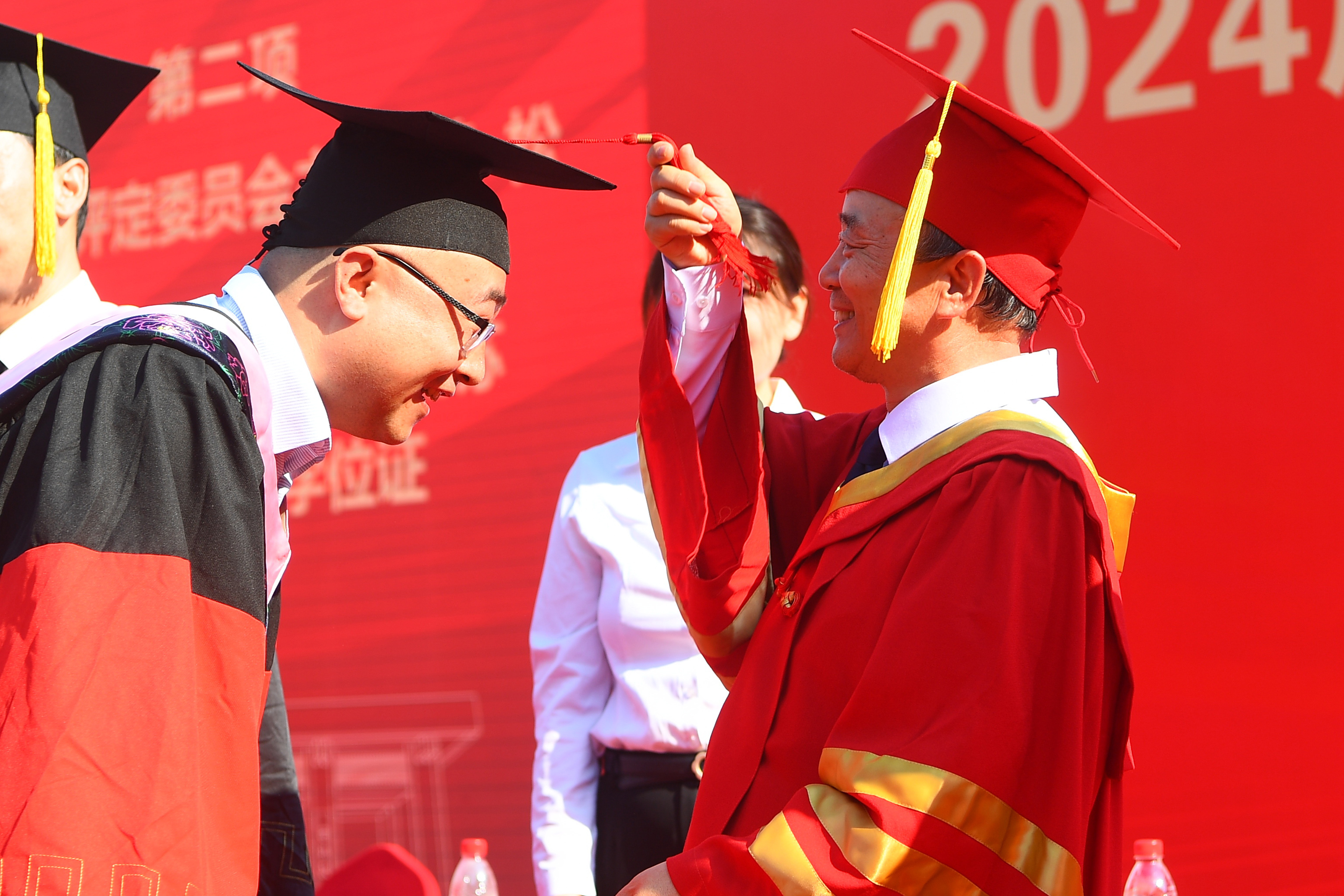 校学位评定委员会主席韩松及校学位评定委员会委员代表为本届博士研究生、往届毕业生代表和本届硕士研究生拨流苏并颁发学位证书。