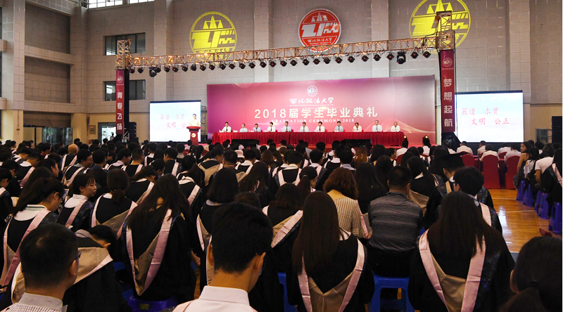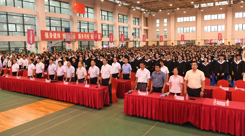 校党政领导,校长助理,各学院院长、党委书记、分管学生工作副书记、本科生毕业班辅导员,各部门负责人,校友代表、教师代表、毕业生亲友代表、在校生代表、留学生、军转干部进高校专项培训班学员及2018届全体本科毕业生共同见证这一值得铭记的时刻。校党委副书记赵健主持毕业典礼。