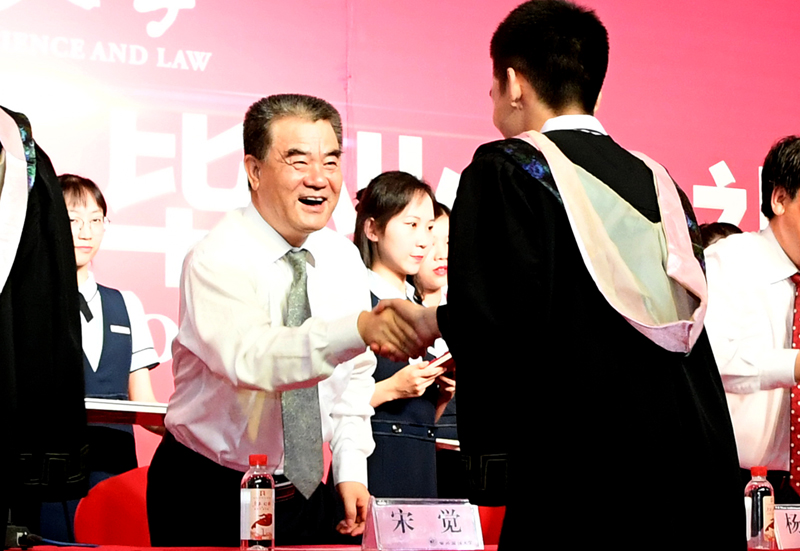 杨宗科对2018届毕业生提出了三点希望:一是有西法大人的鲜亮底色。81年的砥砺前行、弦歌不辍,铸就了西法大的红色基因底色。作为西法大红色基因底色的传承者,要政治坚定、信念永恒,志向中国梦,做好政法人,勇担时代使命。“勇于创新”是老延大的光荣传统,作为西法大创新底色的擦亮者,要善于倾听时代的声音,紧跟时代步伐,把握时代脉搏,不断汲取新思想、树立新思维、掌握新方法,以创新求进,以创新求强,以创新求胜。希望毕业生们在大学的象牙塔里,既收获了丰富的知识、树立了自信独立的人格,培养了成就优秀的习惯,又能将西法大的精神、风骨,“严谨、求实、文明、公正”的校训,“老延大”的光荣传统,“廉足以为仪表”的镜鉴一起装入行囊带走,并春风化雨融入血液,内化于心、外化于行;二是有西法大人的处事底气。底气来源于扎实的专业功底、诚实的人格品质、朴实的处事风格。毕业生要迎接挑战、建功立业,要立身社会,学习再学习、实践再实践,拨冗潜学、心无旁骛,通过积蓄能力底气,赢得主动、赢得优势、赢得未来。要忠诚国家、忠于人民,实事求是,追求真理。要超越小我之我,追求大我之我,以朴实的工作作风,与人民水乳交融,重实际、说实话、务实事、求实效,为西法大人争光;三是有西法大人的为人底线。西法大学子要怀有对法律的敬畏之心、尊崇之心,主动地去维护和践行法律的公平正义,成为学习法律、践行法治的楷模,以实际行动维护社会公平正义,守住法律底线。要将爱国之情报国之志融入奋斗之中,用理想之灯照亮前行之路,严守政治规矩、政治纪律,守住政治底线。要继承好学校赋予的宝贵精神财富,将其作为自己的人生指南,守住道德底线。