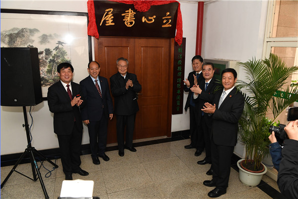 10月28日上午,我校“立心书屋--赵馥洁教授捐赠图书阅览室”揭牌仪式在长安校区图书馆举行。赵馥洁教授及部分亲友,中共陕西省委高教工委书记董小龙、陕西省教育厅厅长王建利、陕西省法制办公室主任王占峰、陕西省公安厅刑事侦察局局长吴仲飞、陕西省人民检察院党组副书记、副检察长贾宇,我校领导宋觉、杨宗科、赵健、肖道远、宣力、刘鹏伟、李玉朝、漆思、王麟、王健,校长助理汪世荣,学校相关职能处室以及哲学与社会发展学院负责人,部分返校校友,师生代表以及图书馆工作人员参加了揭牌仪式。西京学院党委书记马永侠、西安欧亚学院党委书记许尚年、西北大学纪委书记李邦邦、陕西广播电视大学党委副书记罗新远、学前师范学院纪委书记王凯、陕西省孔子学会学长刘学智教授、大家书画院院长张亚林、知名书画家刘亚谏等应邀参加了活动。揭牌仪式由副校长王健主持。