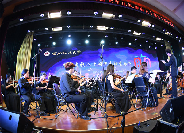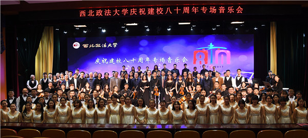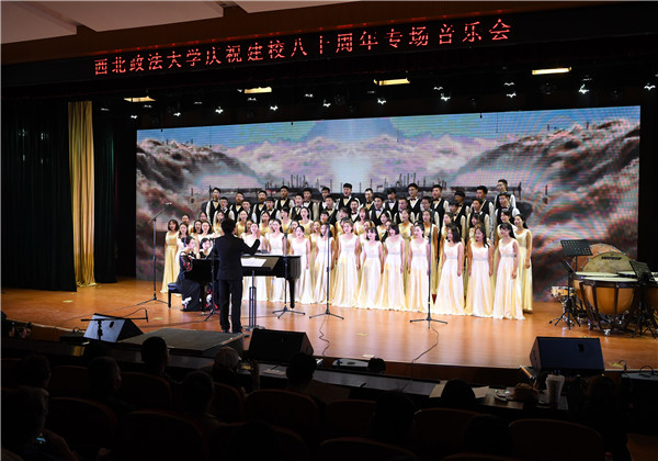 音乐会在《西北政法大学校歌》中走向高潮。由成仿吾作词、吕骥作曲的《陕北公学校歌》是一首在烽火岁月广为传唱的时代强音。为继承和发扬陕北公学优良精神与传统,这首歌曲后经我校前校长贾宇填写第二段歌词,校党委研究决定,正式确定为《西北政法大学校歌》。