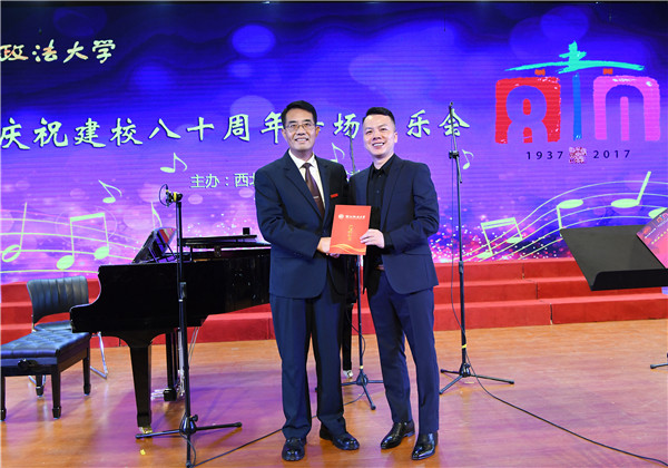 音乐会开始前,校友工作办公室主任孙学龙主持进行了我校96、97、98级四位校友联合向学校捐赠价值19.6万元的三角钢琴一台,原经济法系93级校友集资捐赠5万元的校友捐赠仪式,宣布西北政法大学艺术教育基金正式成立。