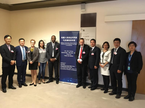 9月11日,联合国人权理事会第36次会议在日内瓦开幕,中国人权研究会和荷兰阿姆斯特丹自由大学跨文化人权中心在日内瓦万国宫共同举办以“构建人类命运共同体与发展权的实现”为主题的边会。来自中国人民大学、南开大学、山东大学、西南政法大学、西北政法大学、荷兰阿姆斯特丹自由大学、荷兰乌特勒支大学、南非大学塔博•姆贝基非洲领导力研究所的人权领域专家学者在会上进行了会议发言,并与参会代表进行了对话交流。联合国人权高专办有关官员和俄罗斯、古巴、南非、缅甸、新加坡、印度尼西亚等国家的政府代表团代表、非政府组织代表、新闻媒体记者等约50人与会。新华社、中央电视台等中外媒体报道了中国人权代表团的活动。
