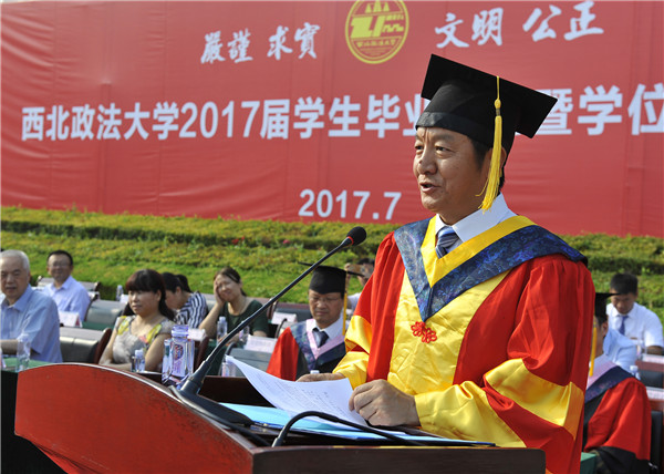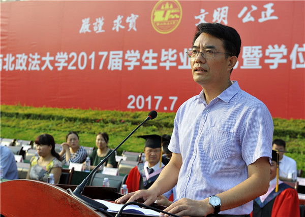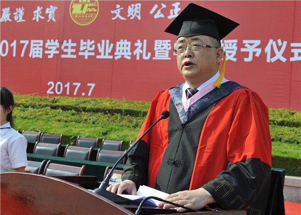 校长贾宇代表学校在2017届学生毕业典礼上致辞。他向全体毕业生表示衷心的祝贺,并以“立身为公、力学达成、行稳致远”为主旨,向毕业生们提出了三点希望:一是要担当使命,立身为公。要有大的格局和站位,自觉与国家同向同行,始终秉承“严谨、求实、文明、公正”的校训,以国家富强、民族昌盛、人民幸福为己任,努力在各行各业、各个领域做出杰出成就,成为治国安邦、经世济民之才;要信仰坚守、信念坚定,要固守法治底线,做法治文化的守护者和传播者、法治国家的建设者和引领者,追求公平正义,捍卫法治理想,在责任与担当中砥砺前行;要想问题办事情出以公心、维护公利、关心公益、守护公德,要身体力行,一点一滴去推动社会进步。二是要好学近智,力学达成。好学近智,力学达成,是千古年来人生经验的总结,只有力学不倦,才能具有知识、才能和智慧,取得事业上的成功;好学近智,力学达成,是适应现代社会发展的需要,要不断完善自身知识储备,勇于接受新思想、开阔新眼界、增长新本领,进而成就一番事业,引导时代潮流;好学近智,力学达成,是充实自己、升华自己的不二法门,腹有诗书气自华,要博览群书、精读好书,以兼具士人之风骨、诗人之情怀、学人之风范、哲人之慧心。三是要守拙务实,行稳致远。要具有恒心,专注做事,切忌半途而废;要努力求真,不图虚名、不慕虚妄,脚踏实地,稳扎稳打;要张弛有度,陶冶情操,丰富人生角色;要善待挫折,处变不惊、临危不惧;要严格自律,节制物欲,崇尚简约,量力而行,知足常乐。