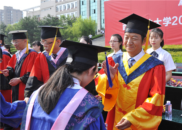 毕业典礼结束后,举行了2017届学生学位授予仪式。仪式由副校长王瀚主持。学位评定委员会委员、副校长王麟宣读了《关于授予2017届毕业生学位的决定》和《关于表彰2017年上半年优秀硕士学位论文作者及指导老师的决定》。校学位评定委员会委员们为依次走上主席台的学子们拨流苏并合影留念。