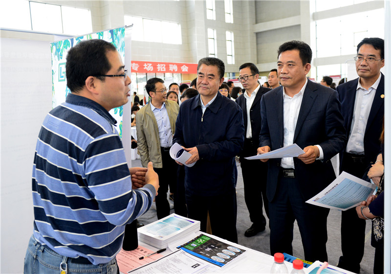 座谈会结束后,王紫贵一行在宋觉、赵健和相关部门负责人的陪同下来到招聘会现场,看望招聘单位代表、了解单位用人需求,并与应聘毕业生亲切交谈。他表示,希望用人单位与各高校积极加强合作、实现双赢。在详细了解参会学生的专业情况与求职愿望后,他勉励应聘的大学生要保持良好心态,转变择业观念,扎根基层、勇于拼搏,用所学的知识积极奉献社会、实现人生价值。