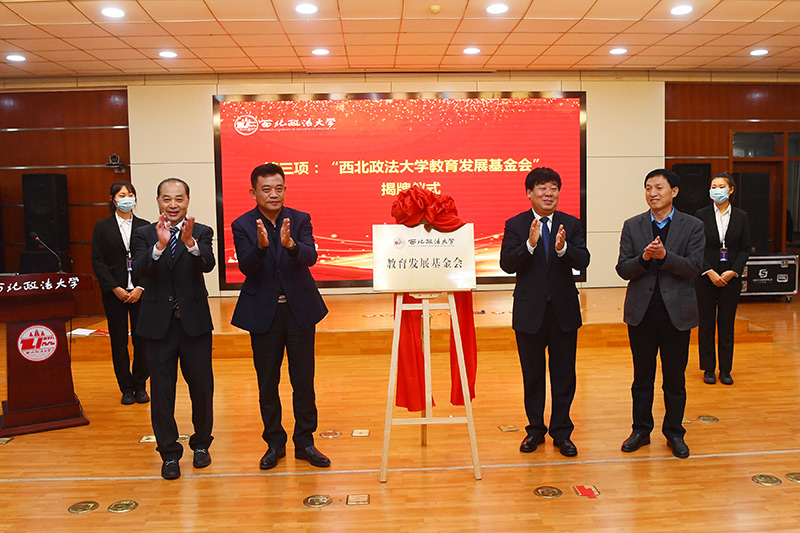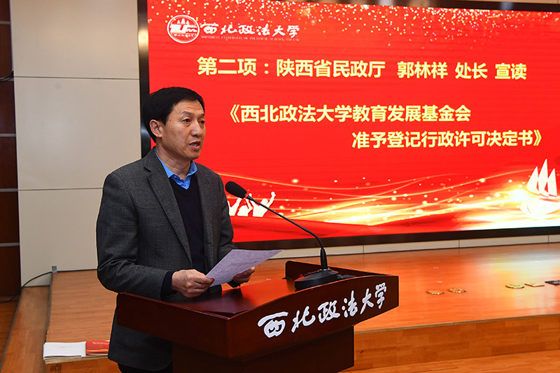 第二项,陕西省民政厅社会组织管理局处长郭祥林向大会宣读了《陕西省民政厅准予行政许可决定书》,并和陕西省教育厅副厅长王紫贵、西北政法大学校长杨宗科、西北政法大学教育发展基金会理事长薛峰一起为西北政法大学教育发展基金会揭牌。