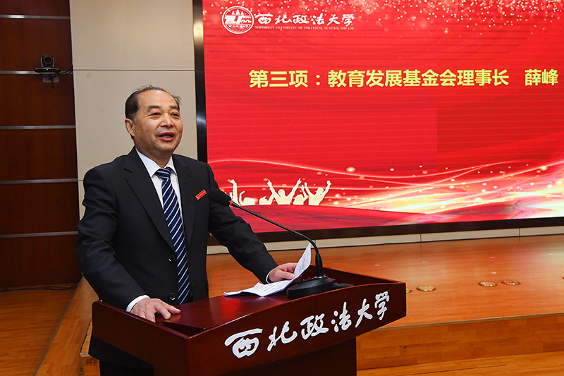 签约仪式后,教育发展基金会理事长薛峰发表讲话。薛峰表达了对各位校友回馈母校的感谢,并对基金会的发展提出两点希望:其一是坚持制度领先,公开透明,接受监督,树立良好形象;其二是坚持严格管理,认真积极开展工作,为学校的人才培养做出贡献。薛峰以其具有37年西北政法大学教龄的老师的名义,表达对校友们的深深感谢,表示自己将努力承担基金会赋予的光荣责任,守好为学生教育与发展的基金,为学校人才培养提供不竭的动力支持。