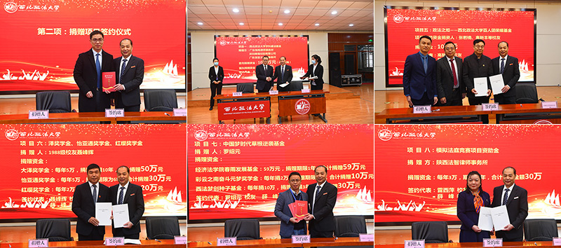 接下来,进行了基金会捐赠项目签约仪式,先后有九个项目完成了现场签约。这些项目分别是:(1)孔亚楼校友发起设立的“西北政法大学学科建设基金”项目,意向捐资1000万元,首批捐赠启动资金100万元;(2)孔亚楼校友发起设立“西北政法大学春苗扶助基金”项目,捐赠启动资金10万元;(3)孔亚楼校友发起设立的“百家律所及百名律师荣耀基金”项目,捐赠启动资金5万元;(4)孔亚楼校友发起设立的“圆梦助学金”项目,计划连续捐赠20年,每年捐赠5万元;(5)高新丰、张若楠、杨朔、冉明睿、朱刚、刘东晓、魏军、张孟东、孙杨等9位校友发起设立的“政法之炬—西北政法大学百人团荣耀基金”项目,捐赠启动资金10万元;(6)聂峰辉校友捐资设立大泽奖学金、怡亚通奖学金、红缨奖学金,意向捐赠100万元,每年捐赠12万元;(7)罗绍元校友捐赠中国梦时代草根逆袭基金99万元;(8)陕西法智律师事务所捐赠“模拟法庭竞赛项目资助金”30万元,计划10年期,每年捐赠3万元。(9)北京市海勤律师事务所意向捐赠50万元,拟设立学生社会实践与素质拓展资助基金,连续捐赠5年,每年捐资10万元。