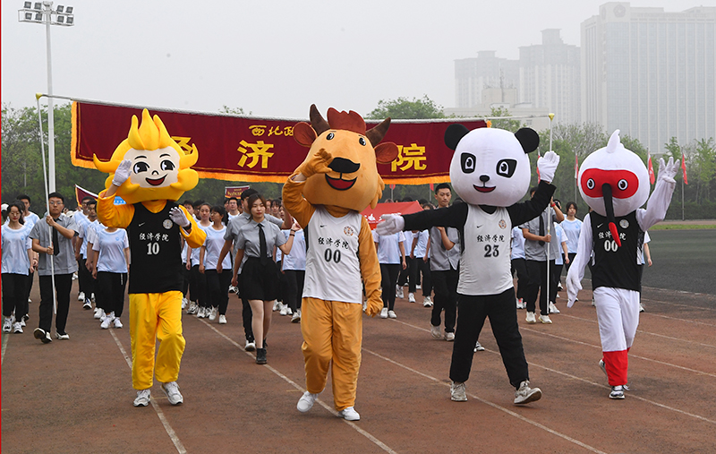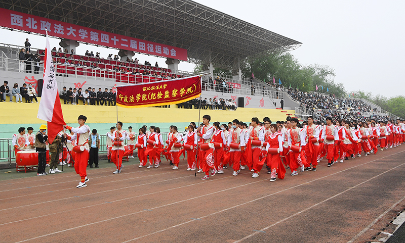 伴随着激情欢快的《运动员进行曲》,国旗护卫队、裁判员方阵及各学院师生方阵依次入场。经济学院代表队身着吉祥物服饰,用可爱的动物形象展现青年人积极向上的精神风貌;行政法学院(纪检监察学院)代表队用高扬的红色丝带为田径场增添了一抹亮色;商学院代表队用圆扇精心排列出“100”字样,以赤子之心庆祝建党100周年……各代表队口号嘹亮、步伐整齐、精神抖擞,结合自身特色融入多种创意元素,引来阵阵喝彩。