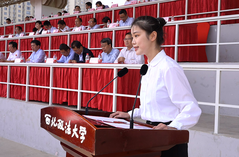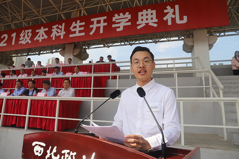 行政法学院(纪检监察学院)2021级4班杨子涵同学代表新生发言,她表示全体2021级同学们将传承红色基因,赓续红色血脉,扛起时代重任,踏上新的征程,努力成长为新一代勇立潮头的西法大人。