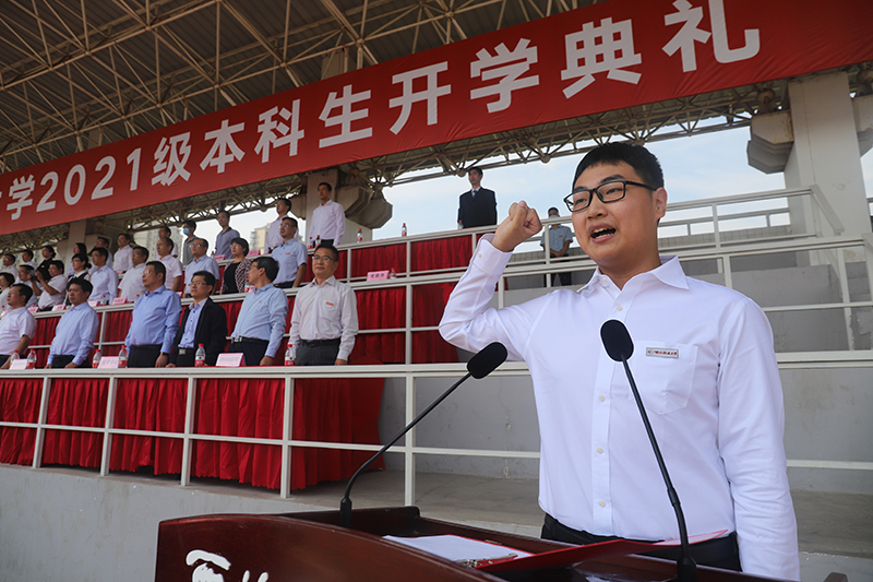 “赓续红色基因,弘扬优良传统;政治坚定,实事求是,勇于创新,艰苦奋斗;谨遵庄严校训,担当时代使命:严谨,求实,文明,公正;热爱祖国,忠于人民;尊师重道,敬业乐群;德法兼修,品学兼优;知行合一,全面发展。为实现中华民族伟大复兴,努力学习!”开学典礼的最后,在民商法学院2021级何天翊同学的带领下,全体新生庄严宣誓。铿锵有力的誓言,是每一位新西法大人对未来的期许和承诺,是同学们前行和奋斗的方向!