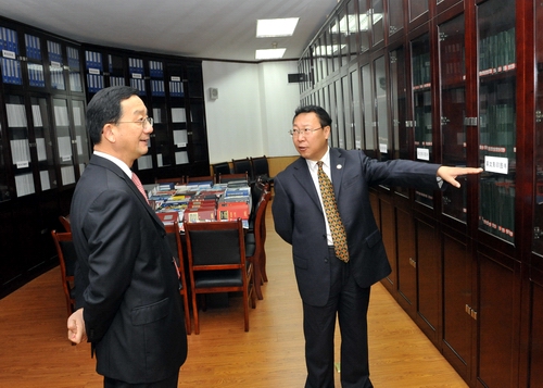 我校国际法研究中心主任王瀚教授详细地向黄惠康司长汇报了国际法研究中心的学术队伍、科研立项、人才培养、资料信息库建设、学术交流以及研究基地的社会服务等方面的情况,并提出了西北政法大学作为国家首批卓越涉外法律人才培养基地的实施院校,与国家外交部进一步加强合作和交流的设想和建议。黄司长细致地参观了新近落成的省级重点研究基地资料信息库-国际法图书馆、国际法学术报告厅、基地会议中心以及航空与空间法、国际金融法、国际争端解决法、中国外资法、国际人权法、气候变化法、上合组织法、网络与电子商务法等八个研究所。国际法图书馆负责人廖向红向黄惠康司长详细汇报了我校国际法资料信息库建设和中外文国际法专业资料的收藏、管理和应用情况。黄惠康司长对我校重视国际法研究中心的发展,坚持不懈地推动和加强国际法学科建设,重视培养青年学术人才,积极推进科研服务于社会和政府决策智库建设表示赞赏,认为我校国际法研究中心的科研工作条件优良、图书资料储藏丰富、科研方向明确、人才培养效果明显。他期望我校国际法研究中心紧紧抓住成为国家首批卓越涉外法律人才培养基地的契机,注重对卓越涉外法律人才培养方法、培养机制的探索,为国家外交需要输送优秀人才。