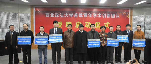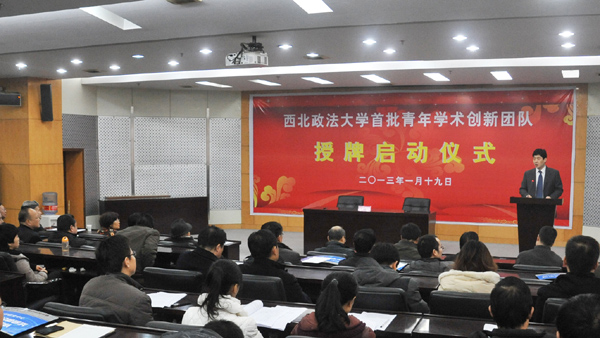 1月19日,我校首批青年学术创新团队授牌仪式在雁塔校区研究生综合楼四楼举行,校长贾宇教授、副校长郭捷教授、王瀚教授、杨宗科教授以及学术委员会成员,有关部门负责人,各学院党政领导和教师代表参加了启动仪式。“全国杰出资深法学家”杨永华教授也应邀莅临,启动仪式由副校长杨宗科教授主持。