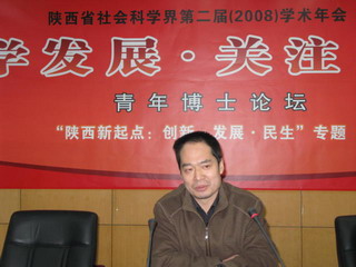 “青年博士论坛”开幕式由西北政法大学经济管理学院副院长胡智教授主持,陕西省社科联副主席胡煜先生致开幕词。陕西省社科联主席、西北政法大学资深教授赵馥洁、西北政法大学副校长王瀚教授、陕西省社科联科普部部长何泽彪、西北政法大学科研处处长汪世荣教授等出席了会议。出席论坛开幕式的还有来自西安交通大学、长安大学、陕西省社会科学院、陕西师范大学、西北农林科技大学、西北政法大学等高等院校的7位青年博士发言人以及西北政法大学经济管理学院的教师、研究生代表等。会议在热烈的气氛中开幕。