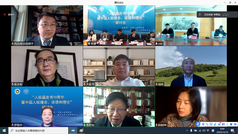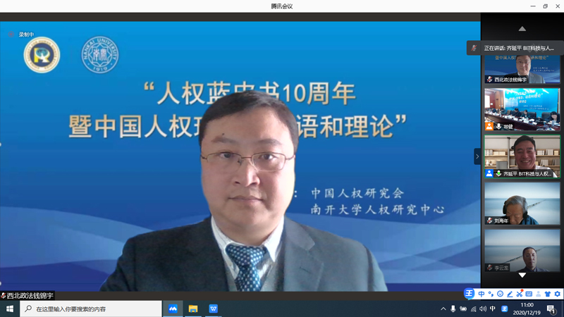 12月19日,中国人权研究会和南开大学人权研究中心共同主办的“人权蓝皮书10周年暨中国人权理念、话语和理论”视频研讨会举行,主会场设在天津。来自国内有关人权研究机构的50多位专家学者参加会议,围绕中国人权理论、人权表达、人权道路等议题进行了深入研讨。我校人权研究中心常务副主任钱锦宇教授在线上参加了此次会议。