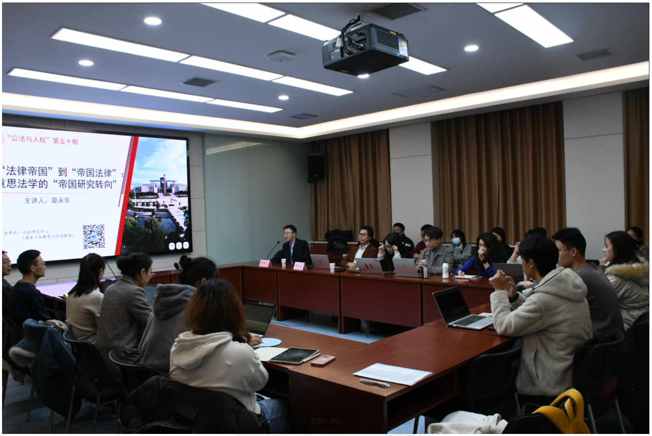 12月10日下午,由人权研究中心主办的“公法与人权”讲坛第50期在雁塔校区人权研究中心会议室举行。北京大学法学院研究员、区域与国别研究院副院长、西北政法大学客座教授章永乐作题为“从‘法律帝国’到‘帝国法律’:重思法学的‘帝国研究转向’”讲座,人权研究中心讲师杨博文主持。