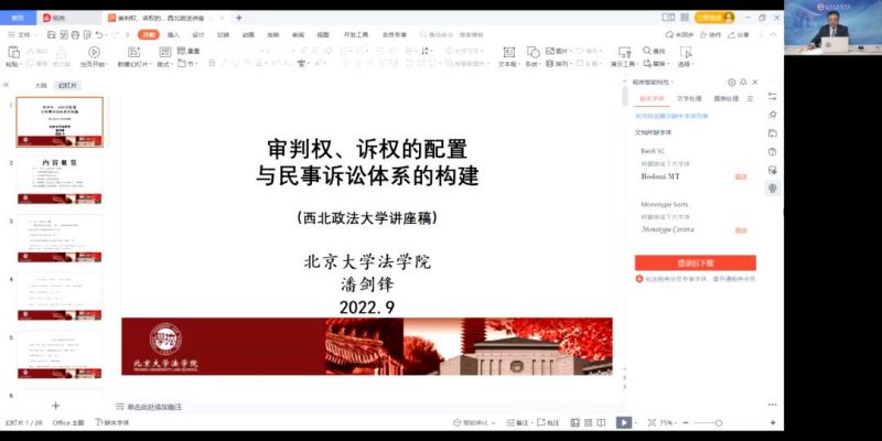 9月27日下午14:30,由发展规划与学科建设处、科研处主办、民商法学院承办的西北政法大学建校85周年系列学术活动“长安大讲堂(2022年第三期)” 以线上线下相结合的形式在我校长安校区举行。北京大学法学院院长、教授、博士生导师,最高人民检察院专家咨询委员、中国法学会常务理事、中国法学会民事诉讼法学研究会副会长潘剑锋作题为《审判权、诉权的配置与民事诉讼体系的构建》讲座,讲座由西北政法大学副校长张荣刚教授主持,民商法学院董少谋教授与民商法学院副院长百晓锋副教授与谈,我校多个学院师生代表50余人在线下会场参加讲座,校内外500余人线上参加讲座。