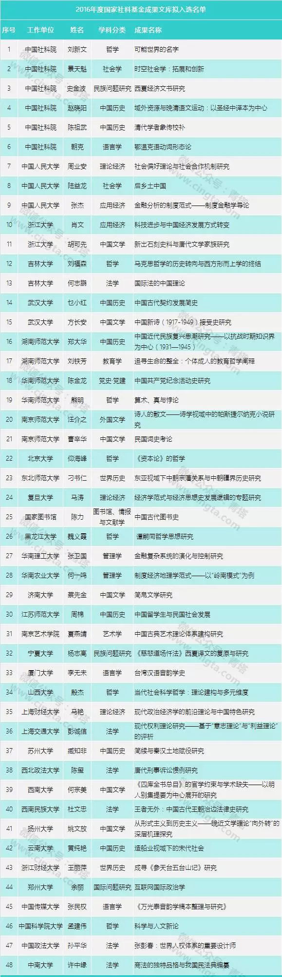 本年度共计有48项成果拟入选,其中哲学、中国历史、法学、中国文学等学科领域成果入选较多,都在6项以上,其余学科的成果入选数量都在3项以下。入选成果的具体名单如下: