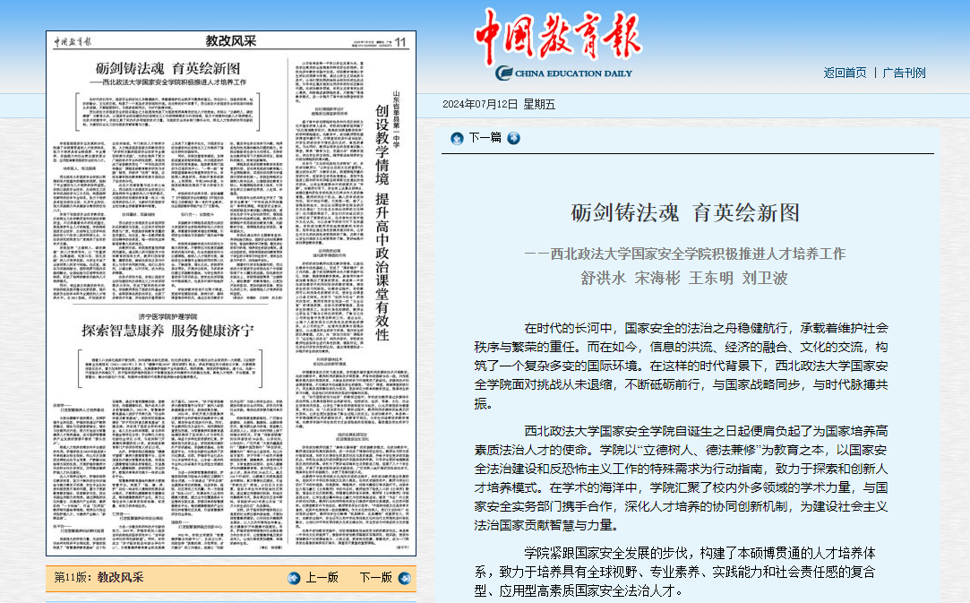 【中国教育报】砺剑铸法魂 育英绘新图——西北政法大学国家安全学院积极推进人才培养工作http://paper.jyb.cn/zgjyb/html/2024-07/12/content_641887.htm?div=-1