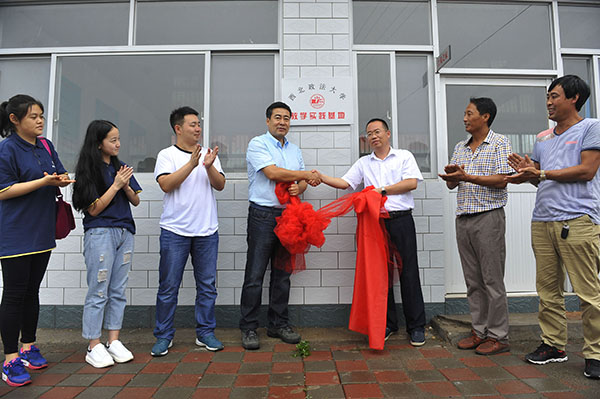 7月19日,西北政法大学新闻传播学院的指导老师(中)与河北省兴隆县半壁山镇代表共同为“教学实践基地”揭牌。