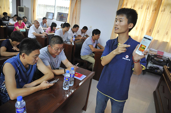 7月19日,西北政法大学新闻传播学院的学生(右一)在兴隆县半壁山镇靳杖子村向村民们介绍新建的微信公众平台“半壁山之窗”的主要内容。