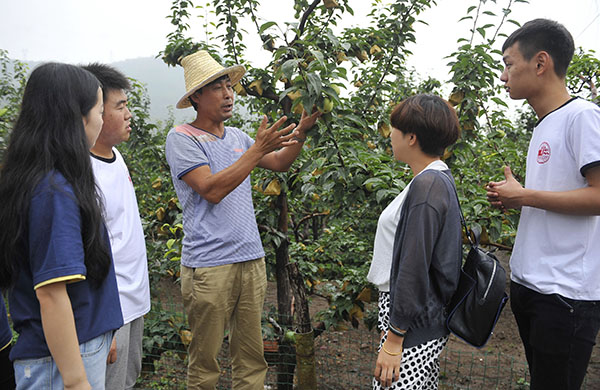 7月19日,兴隆县半壁山镇靳杖子村的村民(中)在向西北政法大学新闻传播学院的几名大学生介绍当地果树的生长规律和栽培方法。
