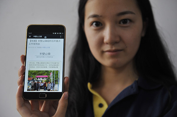7月19日,西北政法大学新闻传播学院的一名大学生在兴隆县半壁山镇展示由该院学生创建的微信公众平台“半壁山之窗”。