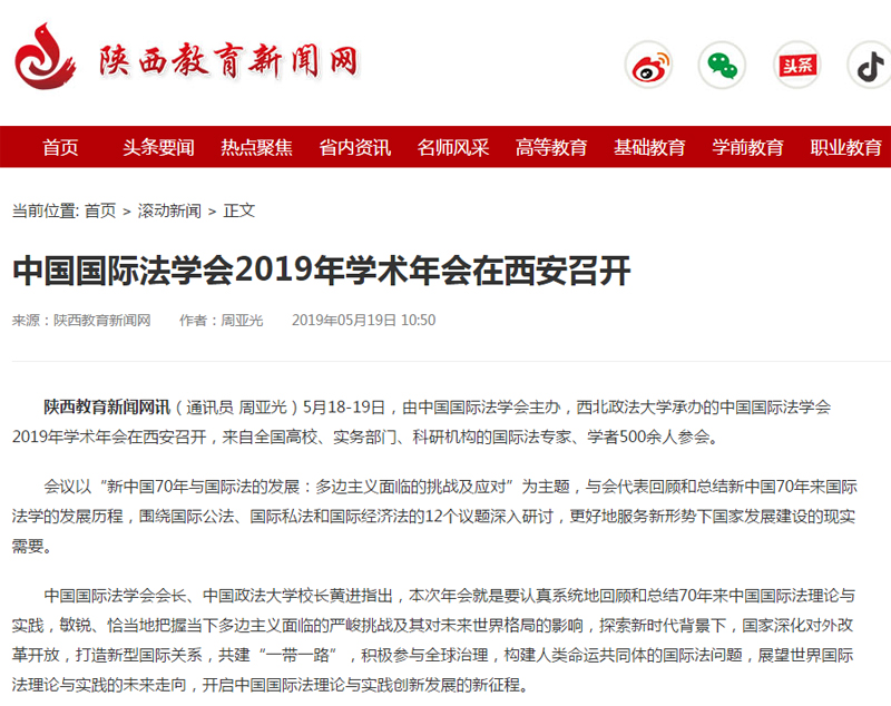 【陕西教育新闻网】中国国际法学会2019年学术年会在西安召开