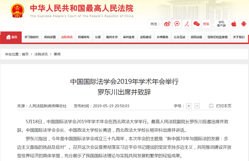 【最高人民法院官网】中国国际法学会2019年学术年会举行 罗东川出席并致辞