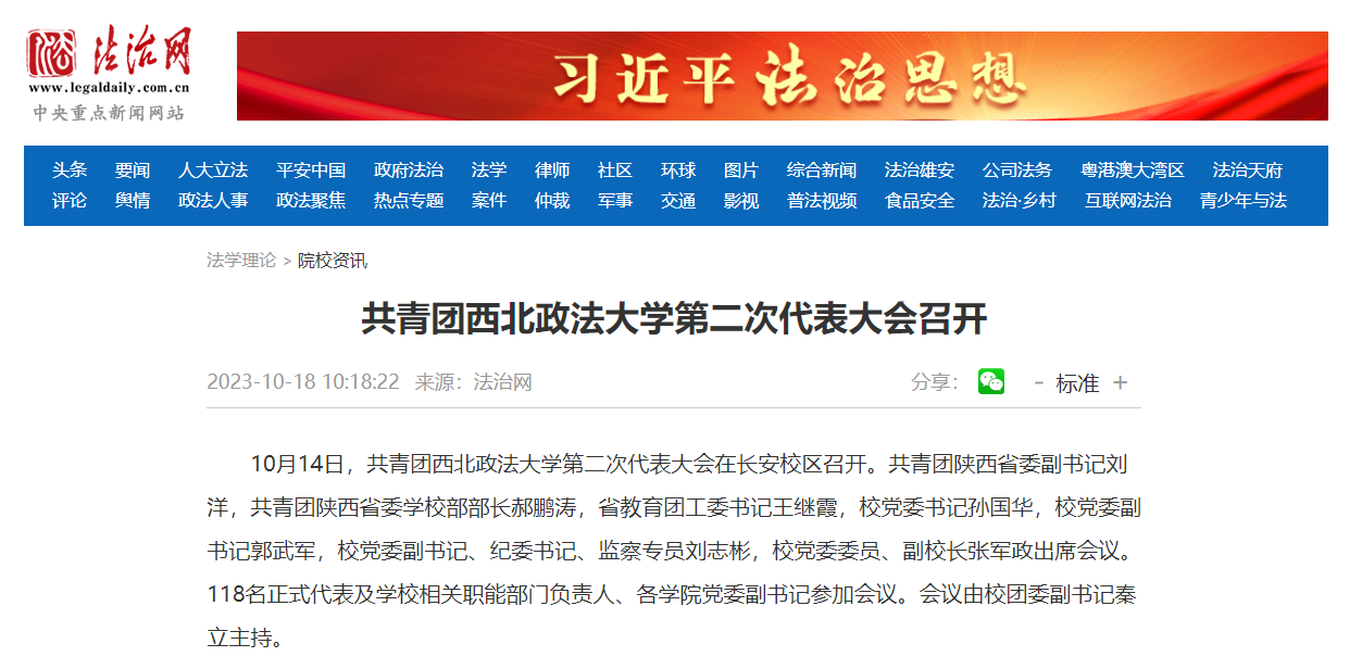 大会选举产生了共青团西北政法大学第二届委员会,审议通过了《关于共青团西北政法大学大学第一届委员会工作报告的决议(草案)》。