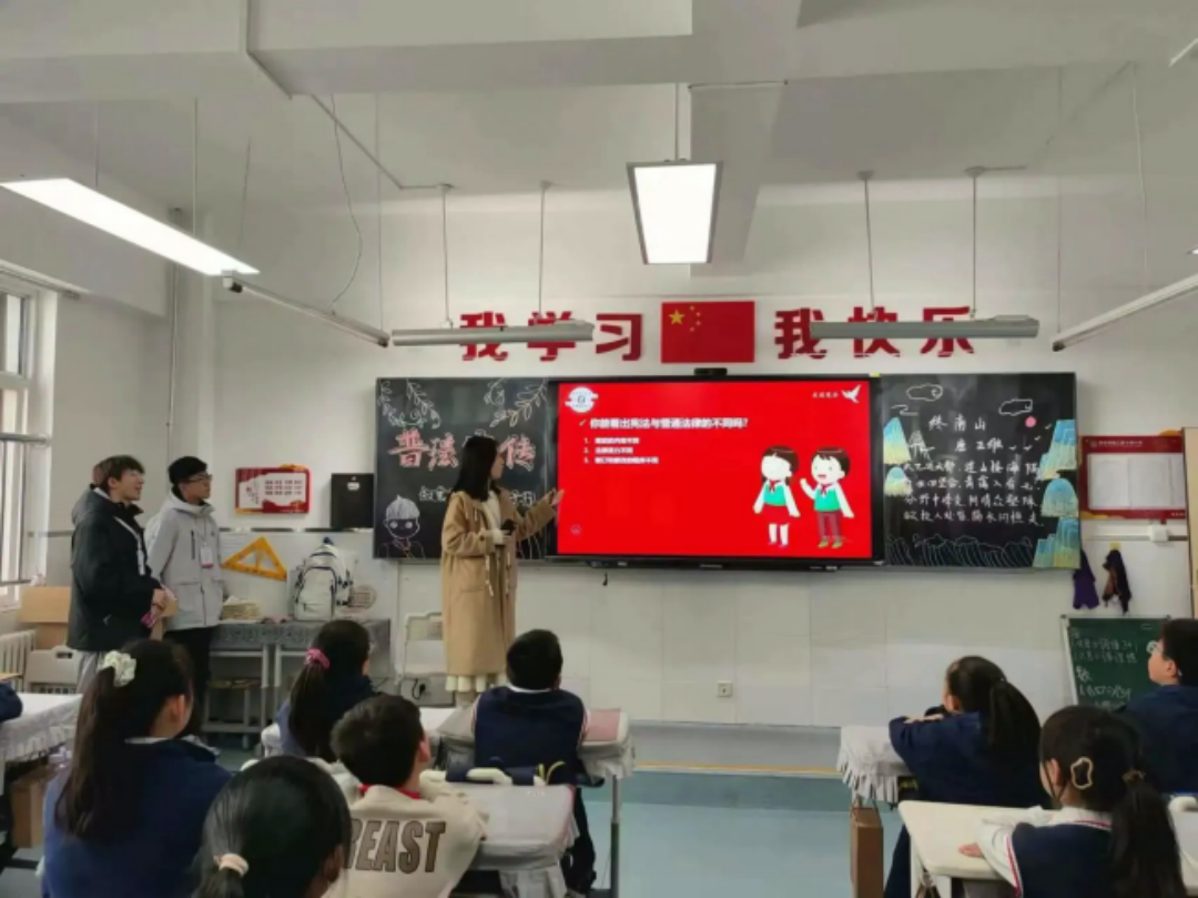 在西安市曲江第十四小学,法律服务中心学生志愿者组成的11支普法小组为三、四、五年级的学生们进行了一场趣味“法律启蒙”。面对充满童趣的小学生,志愿者们通过讲解PPT、组织学生观看法治小视频、设置互动问答的形式将复杂的法律知识简单化,以趣味性的方式传授给孩子们。学生们竞相举手,积极地回答问题,整个教室充满了欢声笑语。