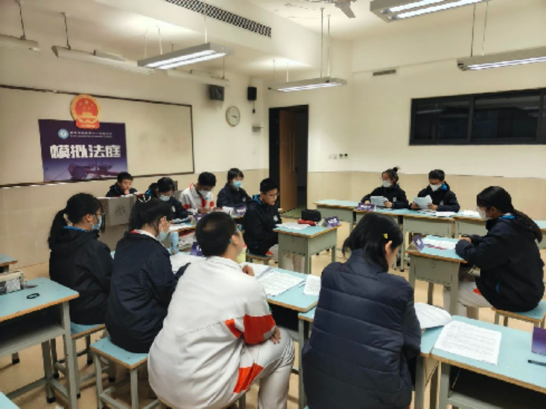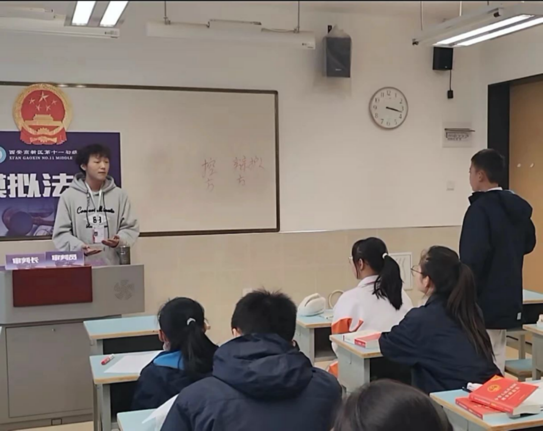 在西安市高新十一初级中学,法律服务中心志愿者对八年级同学进行了基本法律知识宣讲和模拟法庭指导活动。在交流环节,针对同学们自主提问的正当防卫界定、公海、诉讼流程等基础法律知识,志愿者们进行了准确解答。