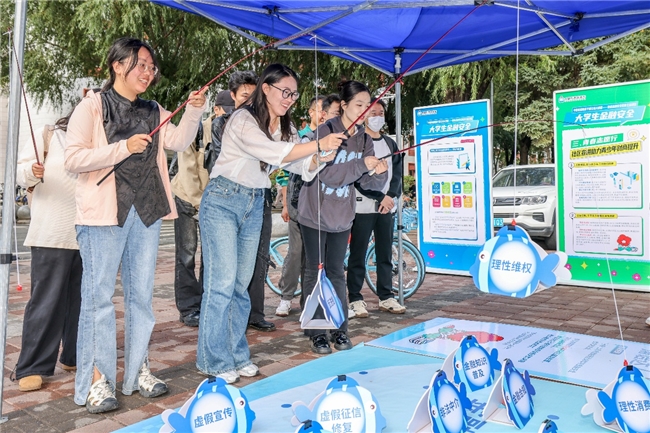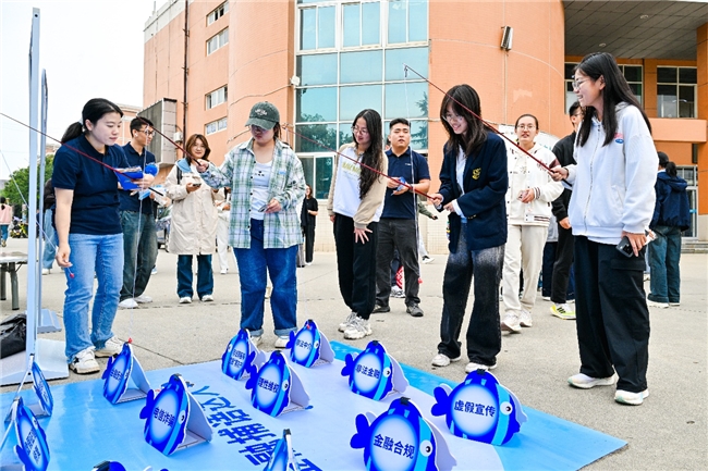 为进一步提升金融知识宣传的趣味性与参与度,郑州大学、南京大学、吉林大学等高校在公益项目知识展板之外,特别设置了互动体验区,推出趣味金融知识游戏——“金融捕语达人”。该游戏以“钓鱼”为互动形式,参与者需识别并避开标注有金融风险词的“小鱼”,成功钓起写有金融安全词的卡片。学生们在轻松活泼的氛围中,深化了对金融安全的理解。