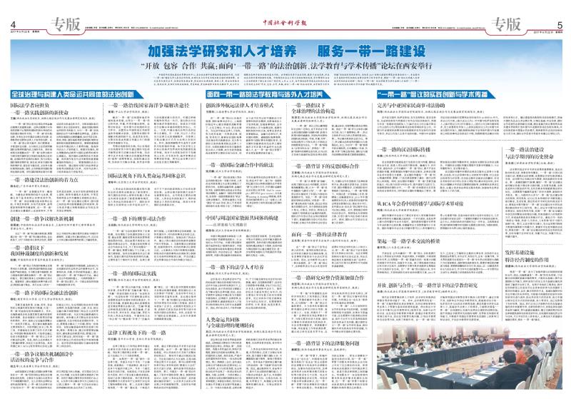 2017年6月22日,《中国社会科学报》以专刊形式,在其第4、5版,专刊登载了由西北政法大学和《中国社会科学》杂志社共同主办的“开放、包容、合作、共赢:面向‘一带一路’的法治创新、法学教育和学术传播”论坛上的研讨成果。这些研讨成果选摘了,包括西北政法大学、《中国社会科学》杂志社等15家单位在内的28位校长、长江学者、法学院院长、主编、专家教授,就“全球治理与构建人类命运共同体的法治创新”、“面向一带一路的法学教育与涉外人才培养”和“一带一路的实践创新与学术传播”三部分内容的精辟发言。