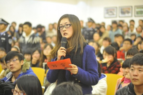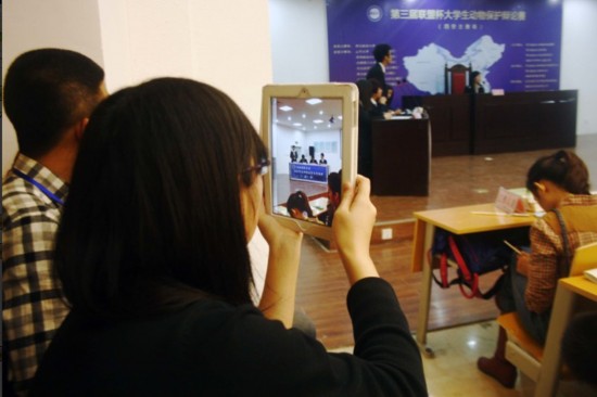图为第三届联盟杯全国大学生动物保护辩论赛决赛现场观众提问