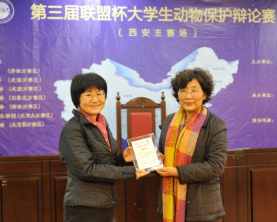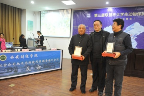 图为西北政法大学经法学院强力教授向资助方代表颁发大学生动物保护教育促进奖