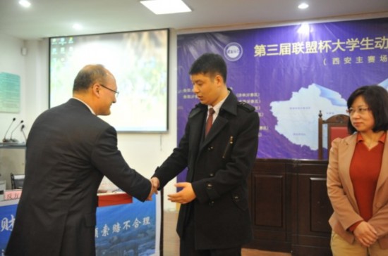 西北政法大学教务处处长王麟教授向支持本届大赛的著名书画家唐瑞臣和张长索先生颁发爱心公益奖