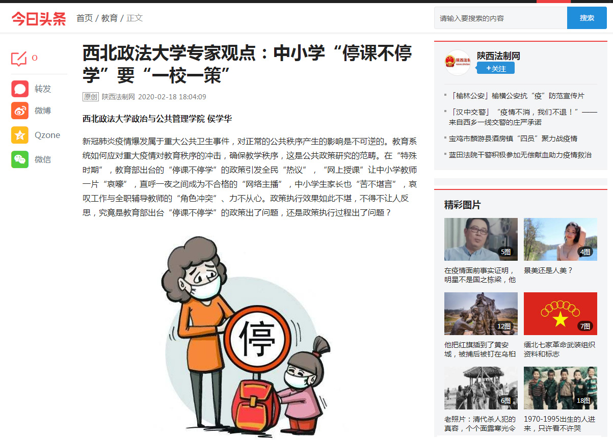 三是以“停课”为契机推动基础教育教学改革,改革“应试教育”所带来的僵化的中小学教学“考核模式”,以灵活多样的形式增加素质教育、国情教育、公共卫生教育等教学内容,培养学生的综合素养。在防控新冠肺炎校园传播期间,“停课不停学”政策为教育公平提供了原始公平的起点,教师利用网络教学资源引导学生自主学习,家长通过家庭教育激发学生的课外学习兴趣,以兴趣教学补充课程教学,以启发、诱导式教学代替死记硬背的灌输,通过比较学习改变教学模式,不断提高学生的自学能力。“停课”可以给教师思考、研究教学改革的空间,增加师生“一对一”的教学互动时间,提高个性化辅导的效果,推动课程教学模式创新。学校利用“停课”时间探索“一校一策”的创新改革,组织教师研究教学改革,挖掘每个教师的潜力,激发教师教学改革创新活力,探索素质教育和公民教育的新形式、新办法。
