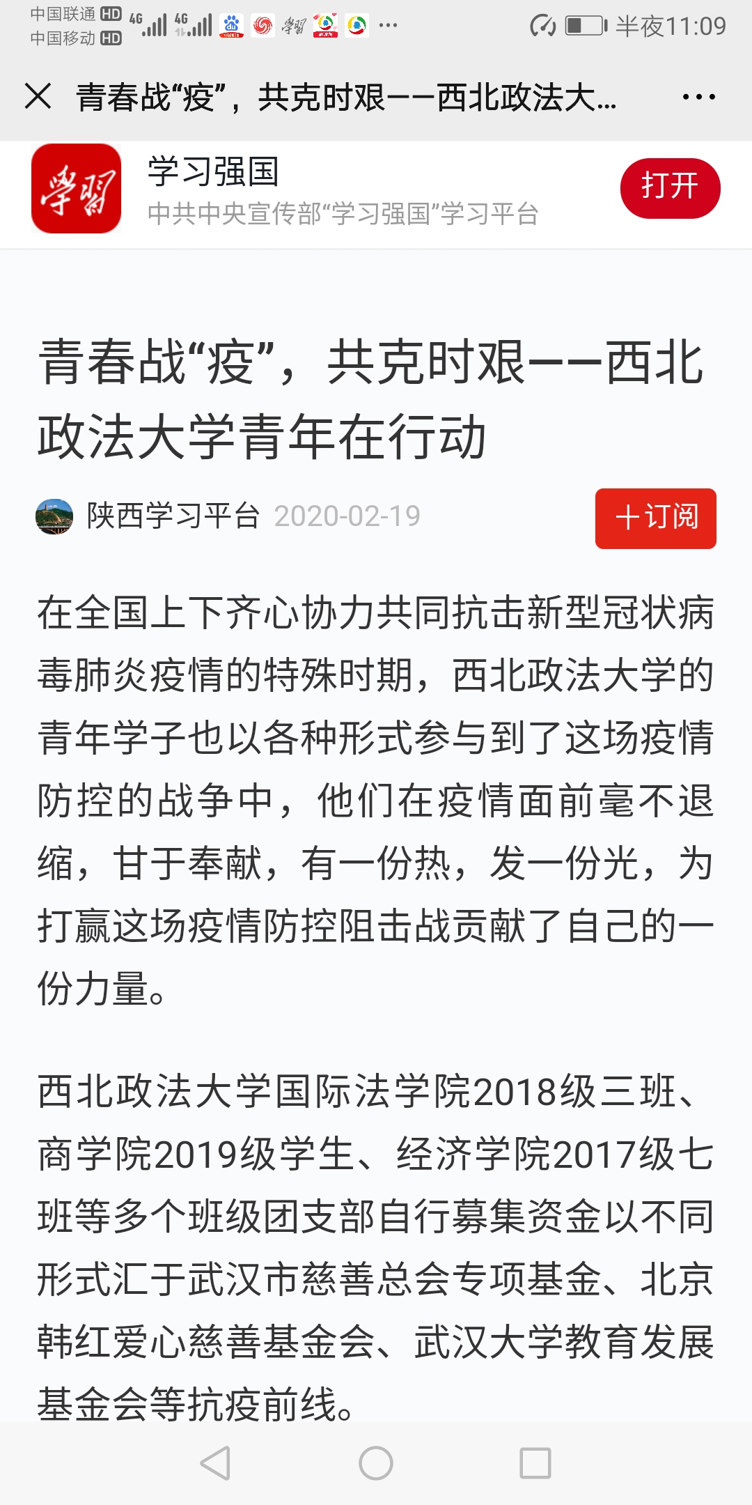 西北政法大学国际法学院2018级三班、商学院2019级学生、经济学院2017级七班等多个班级团支部自行募集资金以不同形式汇于武汉市慈善总会专项基金、北京韩红爱心慈善基金会、武汉大学教育发展基金会等抗疫前线。