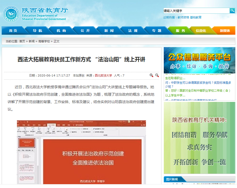 近日,西北政法大学教授李瑰华通过腾讯会议作“法治山阳”大讲堂线上专题辅导报告。她以《积极开展法治政府示范创建,全面推进依法治国》为题,梳理了法治政府的概念,系统地讲解了开展示范创建的背景、工作安排、标准及建议,结合实例对山阳县法治政府创建提出建议。