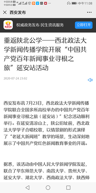 西安发布讯 7月23日,西北政法大学新闻传播学院联合全国多所高校举办的中国共产党百年新闻事业寻根之旅(延安站)”纪念活动顺利举行。在延安清凉山上,陕公旧址前,西北政法大学学子合唱校歌,以情景剧的形式演绎了“老延大新闻班”教学的场景,生动深刻地展示了中国共产党红色新闻教育事业的开端。